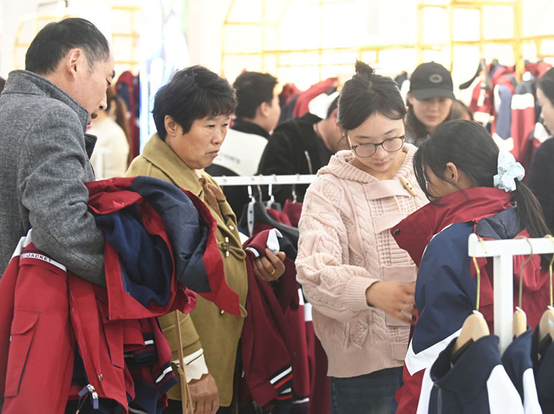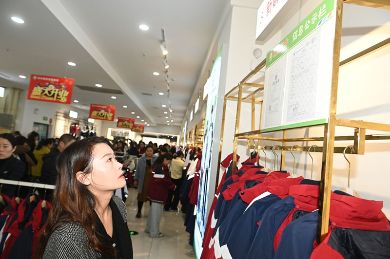 在服务上,构建了“线下实体超市+线上平台”同步运营的融合销售模式。线下超市为家长和学生提供直观体验与即时购买,有效压缩了传统模式下家长与学校之间的信息不对称空间。信息显示,“校服超市”10月25日试营业首日,营业额即突破8万元,接待家长顾客1000余人次;10月26日正式营业,营业额突破17万元,接待顾客2800余人次,反映了家长的接受度。而线上平台则便利了偏远地区家庭的现实需求。